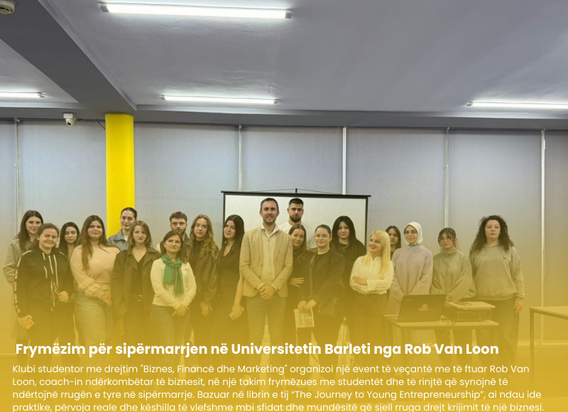 Klubi studentor me drejtim “Biznes, Financë dhe Marketing” në Universitetin Barleti organizoi një event frymëzues me të ftuar Rob Van Loon, coach ndërkombëtar i biznesit dhe mentor i sipërmarrjes së re. Takimi solli në fokus rëndësinë e zhvillimit të ideve inovative dhe transformimit të tyre në iniciativa konkrete sipërmarrëse. Gjatë aktivitetit, Rob Van Loon ndau me...