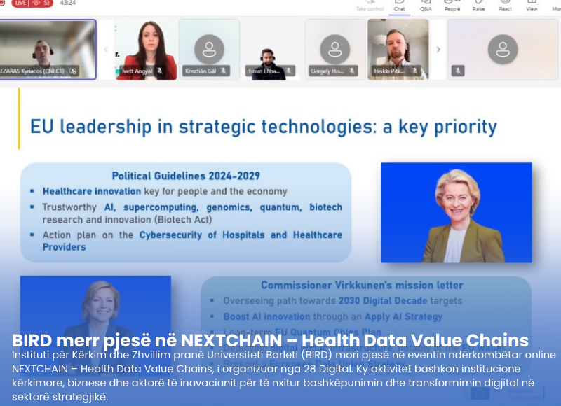 Instituti për Kërkim dhe Zhvillim pranë Universitetit Barleti (BIRD) mori pjesë në eventin ndërkombëtar online NEXTCHAIN – Health Data Value Chains, i organizuar nga 28 Digital, një aktivitet që bashkon institucione kërkimore, biznese dhe aktorë të inovacionit për të nxitur bashkëpunimin dhe transformimin digjital në sektorë strategjikë. NEXTCHAIN është një seri eventesh evropiane që synojnë krijimin e partneriteteve, shkëmbimin e përvojave .